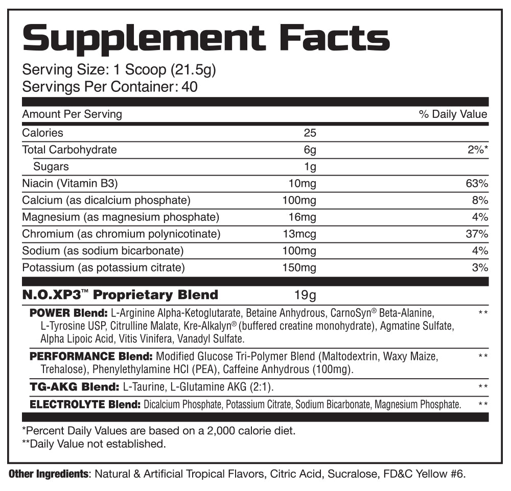 N.O.X-P3’s Power blend offers a plethora of potent pre-workout ingredients like CarnoSyn® Beta-Alanine, Citrulline Malate, Agmatine Sulfate and more to help super-pump your workouts. The Performance Blend offers fuel for your muscles while the TG-AKG™ is all about Taurine and Glutamine. Added to the mix are some key electrolytes to help keep you hydrated during your intense training sessions.