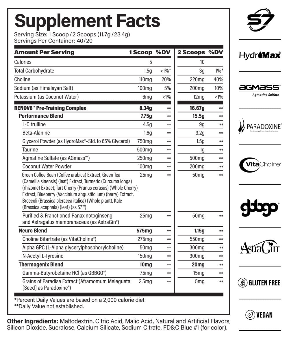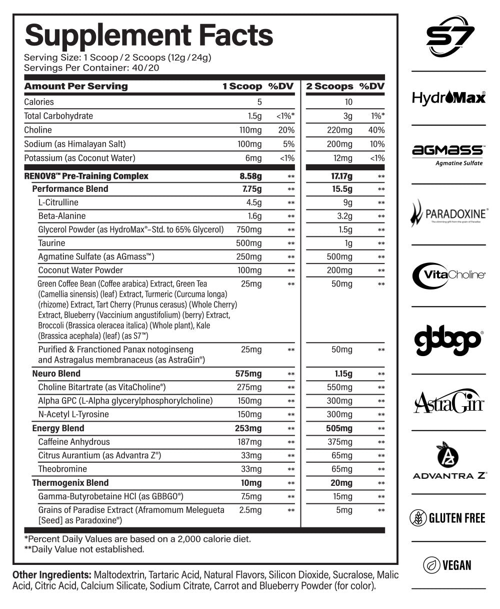 Introducing RENOV8—a fully-loaded, transparent formula that blows the lids off every other pre-workout on the market. Arriving in three variations (high stim, mid stim, and stim free) and two mouth-watering flavors, RENOV8 aims to redefine the pre-workout category as we know it. Its transparent formula boasts a slew of precisely-dosed ingredients that serve as the backbone to its disruptive mission of stripping the industry of mediocrity. Equipped with an array of curated blends designed to maximize pump, focus, energy, and heat, RENOV8 proves itself to be anything but ordinary.